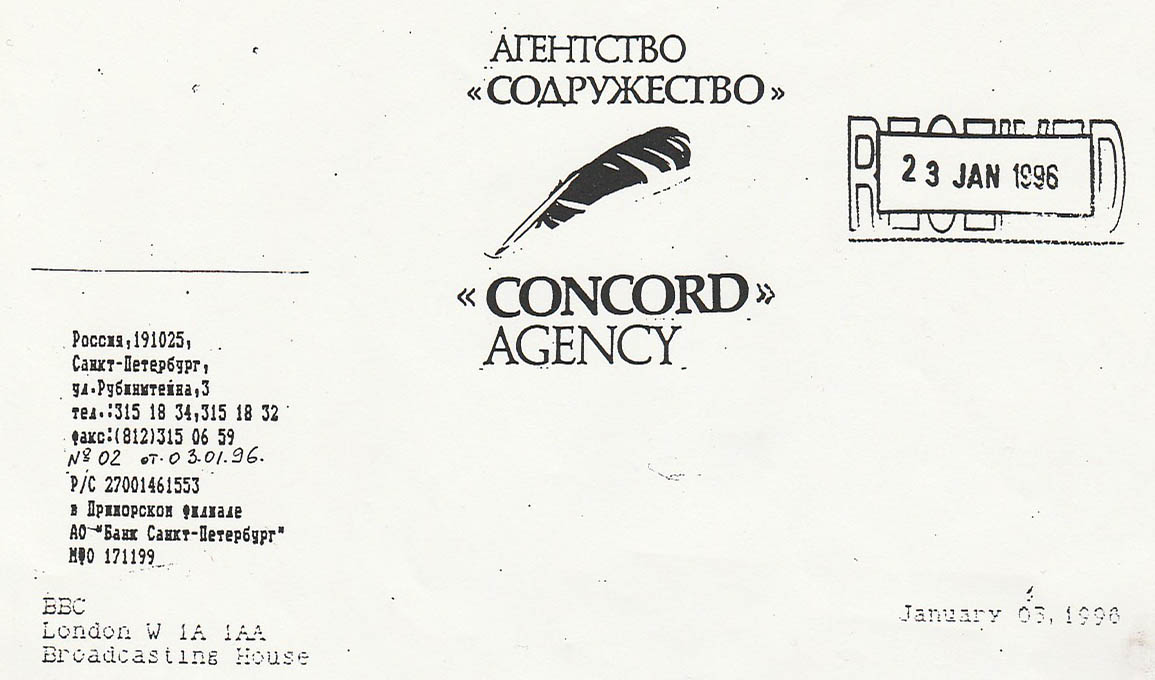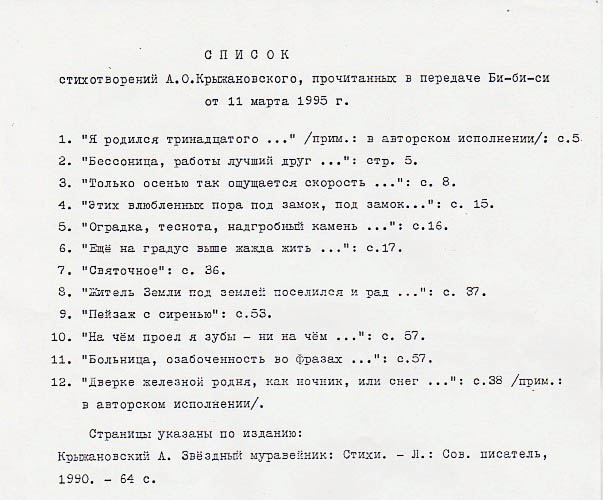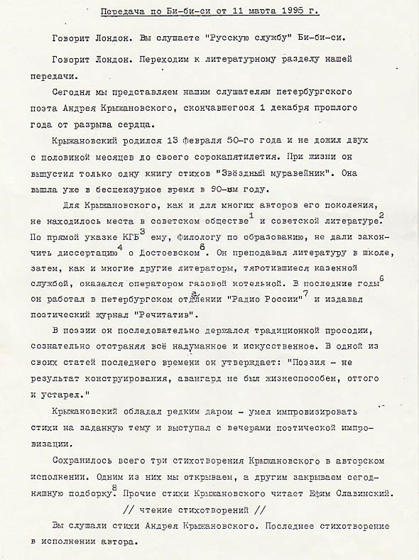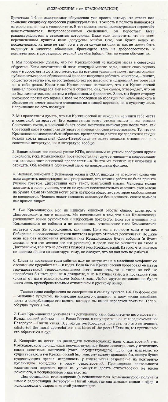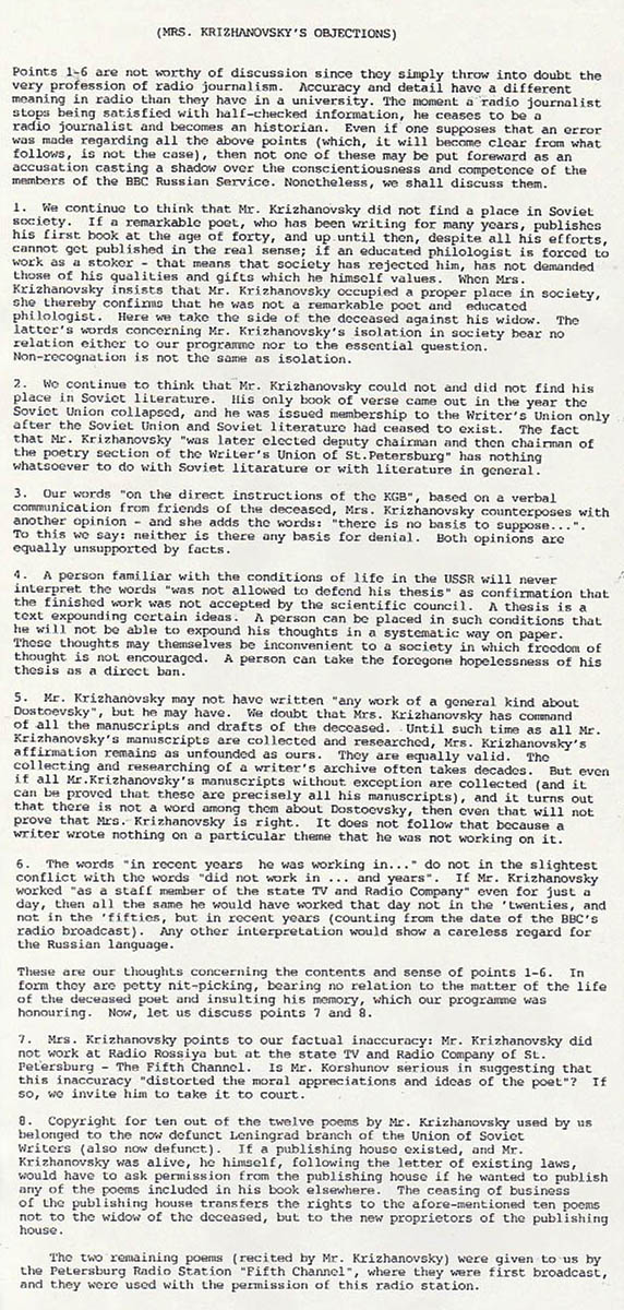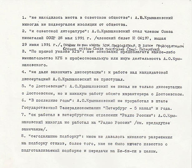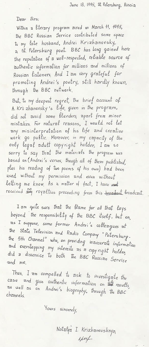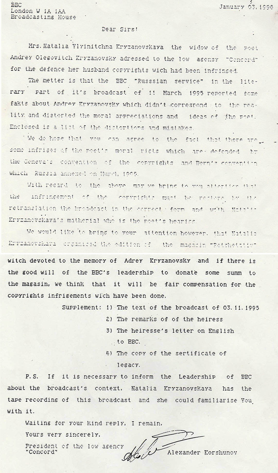 The matter is that the BBC “Russian service” in the literary part of it’s broadcast of 11 March 1995 reported some fakts about Andrey Kryzanovsky which didn’t correspond to the reality and distorted the moral appreciations and ideas of the poet. Enclosed is a list of the list of the distortions and mistakes.