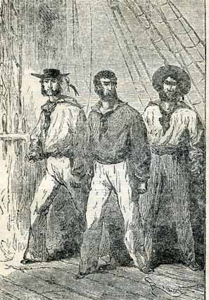 А вот другая картинка: двое матросов конвоируют в кают-компанию пленника Айртона. Матросы — в тех же неизменных шляпах, пленник — с непокрытой головой. Отсутствие шляпы подчеркивает, что человек несвободен.