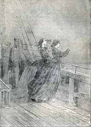 Вот сцена на палубе Дункана: матросы, владелец яхты, капитан и его помощник. Гленарван и капитан Манглс — в строгих черных сюртуках (Герцен сказал бы: сертуках) и фуражках с белым околышем, матросы — с белых блузах с отложными воротниками (под ними — платки) и широкополых шляпах. Картинка черно-белая. Нечто голубое, конечно, должно было быть в костюме матроса, но мы этого не видим. Помощник капитана Остин — тоже в фуражке с околышем, но костюм его — смесь господского с матросским.