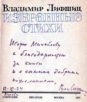 В углу значилось: «Стихи В. Лифшица». Тут мне смутно припомнилось другое, большое и нешуточное стихотворение поэта с такой неблагозвучной для русского уха фамилией и захотелось перечитать Лифшица, а заодно бросить взгляд и на его человеческую судьбу.
