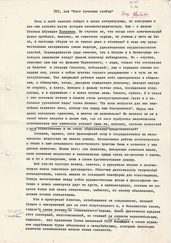 Теперь, если верить сообщениям, Горлита нет, и когда люди бывалые, услышав эту новость, спрашивают: а что вместо него? — я предлагаю им на выбор два варианта ответа: «Свет гуманных свобод» — или «Цепь туманных свобод». Согласитесь: оба лозунга, хотя и с разных сторон, годятся для характеристики новой пропагандистской политики нынешнего руководства. Скептики предпочтут второй, т. е. собственно, изначальный: авторский. Властям же можно уверенно рекомендовать первый — недаром он прошел Горлит. В самом деле, свет гуманных свобод прекрасно поэтизирует правительственную триаду — Гласность, Перестройка, Ускорение, — начальные буквы которой так некстати складываются в сознании многих в мрачную аббревиатуру: ГПУ.