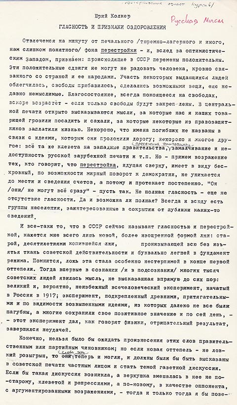 Отвлечемся на минуту от печального (тюремно-лагерного и иного, нам слишком понятного) фона перестройки — и, вслед за оптимистическим Западом, призна́ем: происходящие в СССР перемены положительны. Эти положительные сдвиги не могут не радовать человека, кровно связанного со страной и ее народами. Участь некоторых выдающихся людей облегчилась, свободы прибавилось, сделались возможными вещи, еще недавно немыслимые. Благосостояние, всегда покоящееся на свободах, вскоре возрастет — если только свободы будут закреплены. В центральной печати открыто высказываются мысли, за которые нас и наших товарищей грозили посадить и сажали, за которые некоторые из правозащитников заплатили жизнью. Нехорошо, что имена погибших не названы в связи с идеями, которым они проложили дорогу; нехорошо и многое другое: все та же клевета на западные правительства, пресечение эмиграции, замалчивание и недоступность русской зарубежной печати и т. п. Но — примем возражение тех, кто говорит, что перестройка, идущая сверху, имеет в виду бескровный, по возможности мирный поворот к демократии, не унижается до мести и сведения счетов, а потому и протекает постепенно. «Он (они) не могут все сразу» — пусть так. Не полная гласность — еще не отсутствие гласности. Да и возможна ли полная? Всегда и всюду есть группы населения, заинтересованные в сокрытии от публики каких-то сведений.