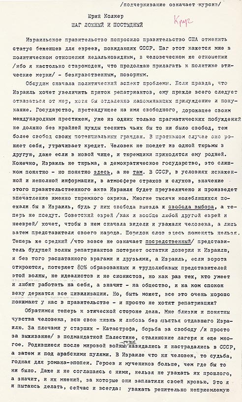 Израильское правительство попросило правительство США отменить статус беженцев для евреев, покидающих СССР. Шаг этот кажется мне в политическом отношении недальновидным, в человеческом же отношении (ибо я настолько старомоден, что продолжаю прилагать к политике этические мерки) — безнравственным, позорным.