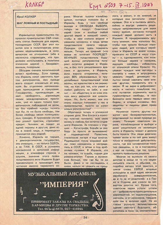журнал КРУГ (Тель-Авив) №509, 7-15 апреля 1987 (с искажениями и купюрами).