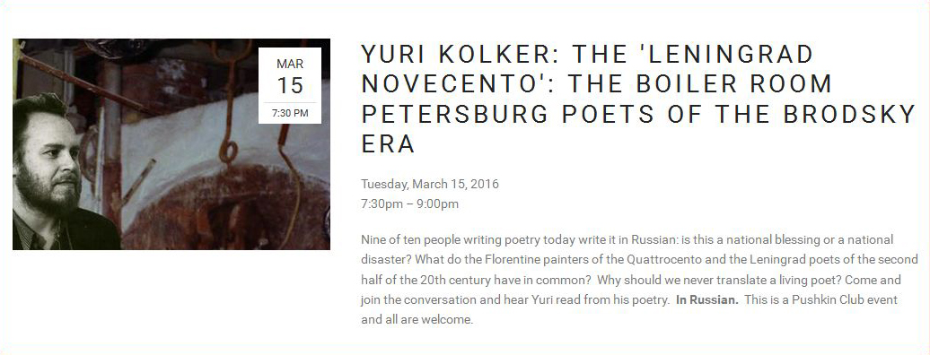 Nine of ten people writing poetry today write it in Russian. Is it a national blessing or a national disaster? Is there something in common between Florentine Quattrocento painters and Leningrad poets of the second part of XX century? What is the talked-about otherness between St. Petersburg and Moscow poetry schools? Why a living poet should never be translated? — A brief sketch of these questions is to be discussed and some poetry read by Yuri Kolker.