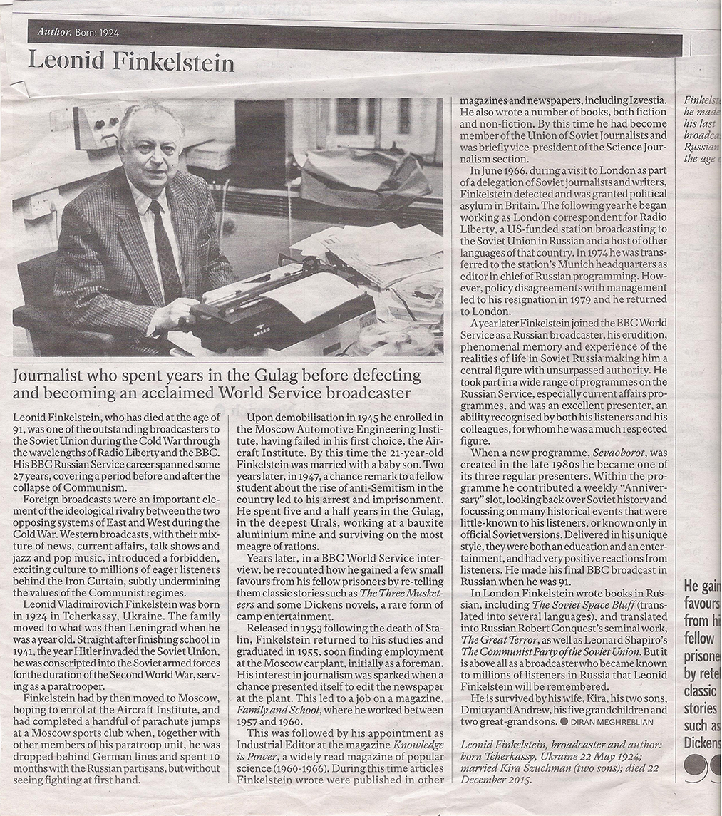 Некролог Леонида Владимирова (Леонида Владимировича Финкельштейна), написанный нашим коллегой по русской службе Би-Би-Си Дираном Мегребляном, был напечатан в газете Индепендент 25 января 2016 года.
