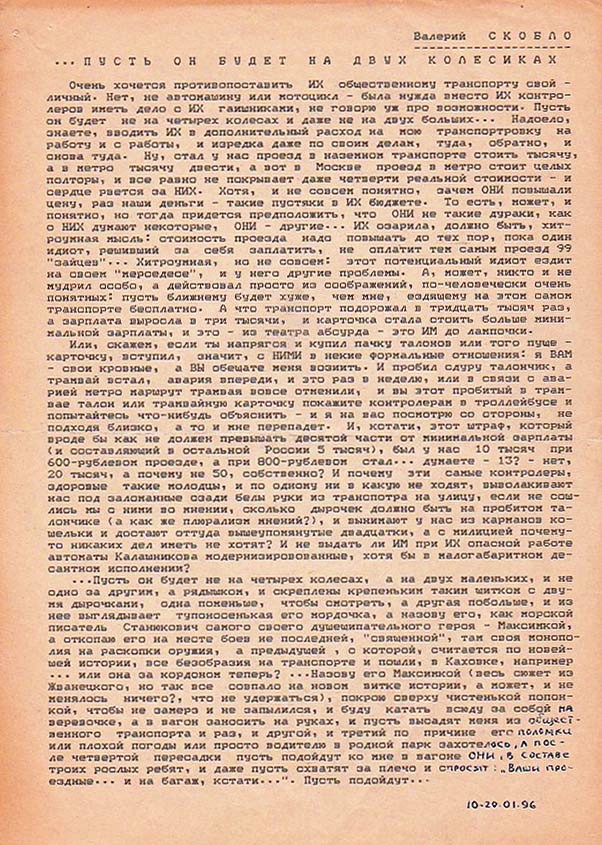 Очень хочется противопоставить ИХ общественному транспорту свой — личный. Нет, не автомашину или мотоцикл — была нужда вместо ИХ контролеров иметь дело с ИХ гаишниками, не говорю уж про возможности. Пусть он будет не на четырех колесах и даже не на двух больших… Надоело, знаете, вводить ИХ в дополнительный расход на мою транспортировку на работу и с работы, и изредка даже по своим делам, туда, обратно, и снова туда. Ну, стал у нас проезд в наземном транспорте стоить тысячу, а в метро тысячу двести, а вот в Москве проезд в метро стоит целых полторы, и все равно не покрывает даже четверти реальной стоимости — и сердце рвется за НИХ. Хотя, и не совсем понятно, зачем ОНИ повышали цену, раз наши деньги — такие пустяки в ИХ бюджете. То есть, может, и понятно, но тогда придется предположить, что ОНИ не такие дураки, как о НИХ думают некоторые, ОНИ — другие… ИХ озарила, должно быть, хитроумная мысль: стоимость проезда надо повышать до тех пор, пока один идиот, решивший за себя заплатить, не оплатит тем самым проезд 99 «зайцев»… Хитроумная, но не совсем: этот потенциальный идиот ездит на своем «мерседесе», и у него другие проблемы. А, может, никто и не мудрил особо, а действовал просто из соображений, по-человечески очень понятных: пусть ближнему будет хуже, чем мне, ездящему на этом самом транспорте бесплатно. А что транспорт подорожал в тридцать тысяч раз, а зарплата выросла в три тысячи, и карточка стала стоить больше минимальной зарплаты, и это — из театра абсурда — это ИМ до лампочки.