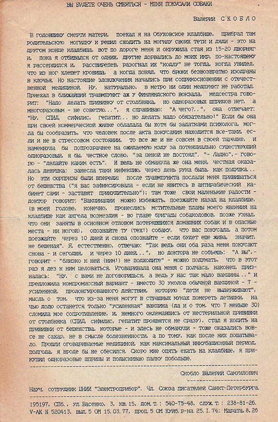 В годовщину смерти матери поехал я на Обуховское кладбище, прибрал там родительскую могилку и решил сходить на могилу своих тети и дяди — это на другом конце кладбища, вот по дороге меня и окружила стая из 15-20 дворняг и, пока я отбивался от одних, другие дорвались до моих икр, по-настояшему я рассердился и, рассвирепев, разогнал их «кодлу» не тогда, когда увидел, что из ног хлещет кровища, а когда понял, что брюки безвозвратно изодраны в клочья. Но настоящие злоключения начались при соприкосновении с отечественной медициной. Ну, натурально, в метро ни один медпункт не работал. Приехал в ближайший травмпункт аж у Финляндского вокзала, медсестра говорит: «Надо делать прививку от столбняка, но одноразовых шприцов нет, а многоразовым — не советую…», я спрашиваю: «А чего?..», она отвечает: «Ну, СПИД, сифилис, гепатит… но делать надо обязательно!» Если бы она при своей коммерческой жилке обладала бы хотя бы задатками психолога, могла бы сообразить, что человек после акта покусания находится все-таки, если и не в стрессовом состоянии, то все же и не совсем в своей тарелке, и намекнула бы попрозрачнее на ожидаемую мзду за потенциально существующий одноразовый, я бы, честное слово, «за ценой не постоял». «Ладно», — говорю — «делайте каким есть». И ведь не обманула же она меня, честная оказалась девушка: занесла таки инфекцию, через день рука была, как подушка… Но эти сюрпризы были впереди; после травмпункта послали меня прививаться от бешенства ("я вас зафиксировала — если не явитесь в антирабический кабинет сами — заставят принудительно»); там тоже свои маленькие радости — доктор говорит: «Вакцинации можно избежать, поезжайте назад на кладбище (в моей голове, конечно, пронеслись мстительные планы моего явления на кладбище как ангела возмездия — во главе бригады собаколовов, позже узнал, что они заняты в основном отловом потерявшихся домашних собак и в опасные места — ни ногой), опознайте ту (тех!) собаку, что вас покусала, а потом поезжайте через 10 дней и снова опознайте — если будет еще жива, значит, не бешеная». Я, естественно, отвечаю: «Так ведь они оба раза меня покусают снова — и сегодня, и через 10 дней…», но доктора не собьешь: «А вы», — говорит, — «близко к ней (ним!) не подходите» — можно подумать, что в этот раз я лез к ним целоваться. Уговаривала она меня с полчаса, наконец, призналась: «Ну, с вами не договоришься, а ведь у нас так мало вакцины…» и предложила компромиссный вариант — вместо 30 уколов обычной вакциной — 7 усиленной, пролонгированного действия, которую «дети не выдерживают», мысль о том, что из-за меня могут в страшных муках помереть детишки, на чью долю останется только «усиленная» вакцина (да и о том, что 7 меньше 30) сломила мое сопротивление, и, немного оклемавшись от нестерильной прививки от столбняка (СПИД, сифилис, гепатит проявятся не сразу), стал я ходить на прививки от бешенства, которые — и здесь не обманули — тоже оказались вовсе не сахар, не в смысле болезненности, а по тому, как после них пошатывало. Прошли оговариваемые медициной, как максимальный инкубационный период, полгода, я вроде бы не сбесился. Скоро мне опять ехать на кладбище, я прикупил одноразовые шприцы и подыскиваю палку побольше.
