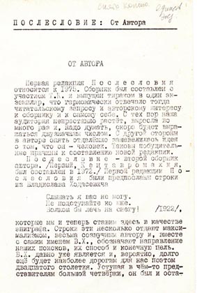 Первая редакция Послесловия относится к 1975. Сборник был составлен с участием Т. К. и выпущен тиражом в один экземпляр, что гармонически отвечало тогда читательскому запросу и авторскому интересу к сборнику и к самому себе. С тех пор наша аудитория непрестанно растет, выросла во много раз и, надо думать, скоро будет выражаться двузначным числом. С другой стороны в авторе опять отдалённо зашевелилась идея о том, что он — человек. Таковы побудительные причины к составлению новой редакции.