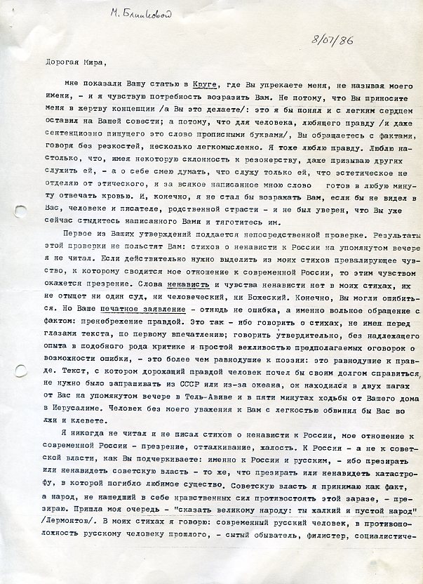 В середине 1986 года, на одном из публичных выступлений я, среди прочих стихов, прочёл два стихотворения об отказниках: о людях, которых годами, десятилетиями, даже поколениями не выпускали из Совдепии в Израиль или в другие страны свободного мира. Cтихи эти, для меня не типичные, отдававшие публицистикой, не из моих любимых, но приличествовавшие времени и месту (собрание было нелитературным), по своему содержанию так не понравились Блинковой, что она подвергла их критике в тель-авивском «беспартийном еженедельнике» Круг, не называя, впрочем, меня по имени. Критики этой нет у меня под рукой, но смысл неудовольствия Блинковой ясен из цитат, приведённых в моём письме к ней. Блинкова нашла читанные мною стихи антирусскими. Характернейший момент: среди русских евреев Израиля худшего обвинения в ту пору нельзя было вообразить. Советскую власть осуждали все, а на русский народ, на великий русский народ великой русской литературы XIX века, все как один смотрели молитвенным взором и ждали от него чудес. Над этим народопоклонством, поистине всемирным в диаспоре советских беженцев, председательствовал тогда, или, по Блоку, простирал крыла Солженицын, пророк и властитель дум, у которого, притом в художественной форме, убедительно получалось, что в большевистском помрачении виноваты инородцы, не в последнюю очередь евреи. И что же? В ответ на это евреи — черта чисто еврейская — с готовностью, даже с пылом брали на себя часть вины за это помрачение, длившееся семьдесят с лишним лет. Блинкова, судя по всему, была из их числа. Моя робкая, в ту пору едва проклюнувшаяся догадка о том, что большевизм — закономерный продукт русской истории, для неё неприемлема. В своём ответном письме ко мне она понимает почвенничество как явление положительное, как «веру в спасительный смысл собственной национальной почвы» России.