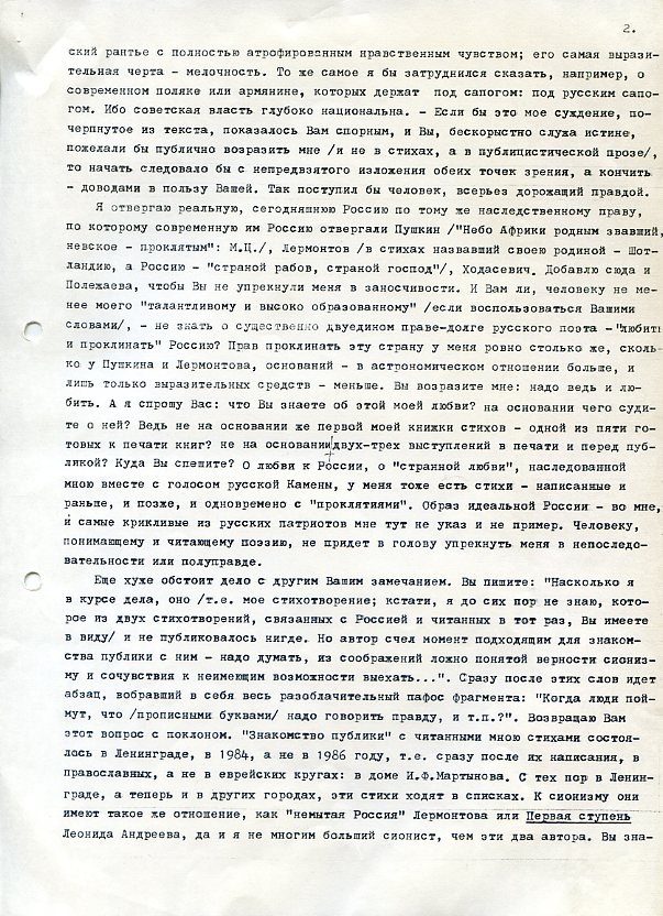 Я никогда не читал и не писал стихов о ненависти к России, мое отношение к современной России — презрение, отталкивание, жалость. К России — а не к советской власти, как Вы подчеркиваете: именно к России и русским, — ибо презирать или ненавидеть советскую власть — то же, что презирать или ненавидеть катастрофу, в которой погибло любимое существо. Советскую власть я принимаю как факт, а народ, не нашедший в себе нравственных сил противостоять этой заразе, — презираю. Пришла моя очередь — «сказать великому народу: ты жалкий и пустой народ» (Лермонтов). В моих стихах я говорю: современный русский человек, в противоположность русскому человеку прошлого, — сытый обыватель, филистер, социалистический рантье с полностью атрофированным нравственным чувством; его самая выразительная черта — мелочность. То же самое я бы затруднился сказать, например, о современном поляке или армянине, которых держат под сапогом: под русским сапогом. Ибо советская власть глубоко национальна. — Если бы это мое суждение, почерпнутое из текста, показалось Вам спорным, и Вы, бескорыстно служа истине, пожелали бы публично возразить мне (и не в стихах, а в публицистической прозе), то начать следовало бы с непредвзятого изложения обеих точек зрения, а кончить — доводами в пользу Вашей. Так поступил бы человек, всерьез дорожащий правдой.