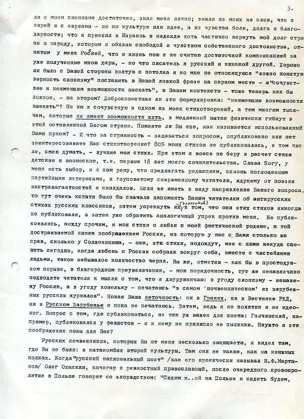 Вы знали о моем сионизме достаточно, зная меня лично; знали из моих же слов, что я еврей и с евреями — не по культуре или идее, а из чувства боли, долга и благодарности; что я приехал в Израиль в надежде хоть частично вернуть мой долг стране и народу, которым я обязан свободой и чувством собственного достоинства, отнятым у меня Россией, что и жизнь мою я не считаю достаточной компенсацией за уже полученные мною дары, — но что писатель я русский и никакой другой. Хорошо ли было с Вашей стороны взятую с потолка и ко мне не относящуюся «ложно понятую верность сионизму» поставить в Вашей ловкой фразе на первом месте — а «сочувствие к не имеющим возможности выехать», в Вашем контексте — тоже теперь как бы ложное, — на втором? Добросовестная ли это формулировка: «не имеющие возможности выехать»? Не им я сочувствую в одном из моих стихотворений, а тем многим тысячам, которые не имеют возможности жить, в медленной пытке физически гибнут в этой оставленной Богом стране. Помните ли Вы еще, как называется использованный Вами прием? — И что за странность — задаваться вопросом, опубликовано или нет заинтересовавшее Вас стихотворение? 80% моих стихов не публиковались, в том числе, смею думать, — лучшие мои стихи. При этом я вовсе не беру в расчет стихи детские и юношеские, т. е. первые 18 лет моего сочинительства. Слава Богу, у меня есть выбор, и я сам решу, что предлагать редакциям, сплошь поглощенным партийными интересами, и глуповатому современному читателю, ждущему от поэзии экстравагантностей и скандалов. Если же иметь в виду направление Вашего вопроса, то тут очень кстати было бы сначала напомнить Вашим читателям об антирусских стихах русских классиков, затем упрекнуть их (классиков) в том, что они этих стихов никогда не публиковали, а затем уже обратить аналогичный упрек против меня. Не публиковались, между прочим, и мои стихи о любви к моей фактической родине, к той достраиваемой нашим воображением России, на которую у нас с Вами столько же прав, сколько у Солженицына, — они, эти стихи, подождут, мне с ними некуда спешить сегодня, когда любовь к России собрала вокруг себя, вместе с чистейшими людьми, такое небывалое количество черни. Вы же, отметив — как бы в простодушном порыве, в благородном преувеличении, — мою порядочность, тут же ненавязчиво подводите читателя к мысли о том, что я двурушничаю: в угоду сионизму — ненавижу Россию, а в угоду кошельку — печатаюсь «в самом "почвенническом" из зарубежных русских журналов». Новая Ваша неточность: ни в Гранях, ни в Вестнике РХД, ни в Русском Зарубежье я пока не печатаюсь. Затем, ведь я не политик и не идеолог. Вопрос о том, где публиковаться, не так уж важен для поэта: Галчинский, например, публиковался у фашистов — и к нему не прилипло ни пылинки. Неужто и эти соображения новы для Вас?