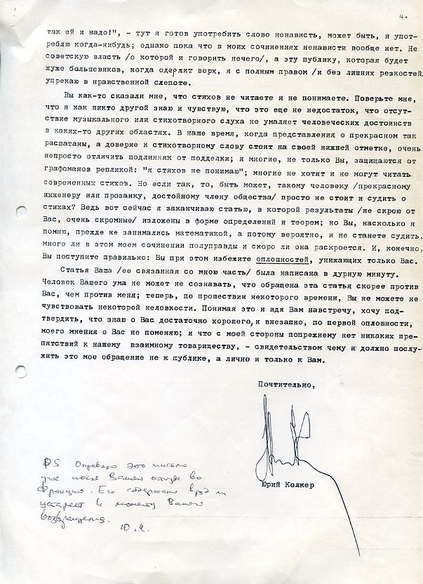 Еще хуже обстоит дело с другим Вашим замечанием. Вы пишете: «Насколько я в курсе дела, оно (т. е. мое стихотворение; кстати, я до сих пор не знаю, которое из двух стихотворений, связанных с Россией и читанных в тот раз, Вы имеете в виду [вторым могло быть это, — Ю. К.]) и не публиковалось нигде. Но автор счел момент подходящим для знакомства публики с ним — надо думать, из соображений ложно понятой верности сионизму и сочувствия к не имеющим возможности выехать…» Сразу после этих слов идет абзац, вобравший в себя весь разоблачительный пафос фрагмента: «Когда люди поймут, что (прописными буквами) надо говорить правду, и т. п.?» Возвращаю Вам этот вопрос с поклоном. «Знакомство публики» с читанными мною стихами состоялось в Ленинграде, в 1984, а не в 1986 году, т. е. сразу после их написания, в православных, а не в еврейских кругах: в доме И. Ф. Мартынова. С тех пор в Ленинграде, а теперь и в других городах, эти стихи ходят в списках. К сионизму они имеют такое же отношение, как «немытая Россия» Лермонтова или Первая ступень Леонида Андреева, да и я немногим больший сионист, чем эти два автора [сионизмом я восхищался, но себя в ту пору называл толстовцем, — Ю. К.].