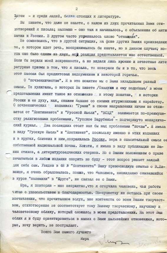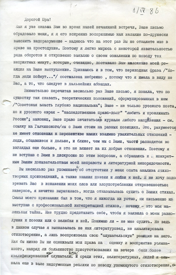Внимательно перечитав несколько раз Ваше письмо, я поняла, что по существу так сказать, теоретических положений, сформулированных в нем ("Советская власть глубоко национальна"; Ваше — не только русского поэта, но и русского еврея — "наследственное право-долг" "любить и проклинать Россию"; наконец, Ваше право печататься в журнале любого направления — см. ссылку на Галчинского) мы с Вами стоим на разных позициях. Это, разумеется не имеет отношения к перспективе наших взаимно уважительных отношений, — люди, общавшиеся и дольше, и ближе, чем мы с Вами, часто расходятся во взглядах еще больше, и это не влияет на их добрые отношения. Поэтому я не вступаю с Вами в дискуссию по этим вопросам, а обращаюсь к конкретным Вашим доказательствам моей неправоты и литературной непорядочности.