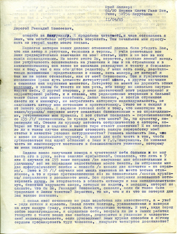 Юрий Колкер: 88/30 Мерказ Клита Гило Бет, Гило, 93756 Иерусалим 11/04/85 |