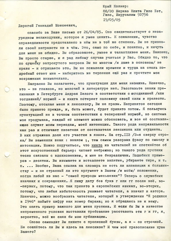Юрий Колкер: 88/30 Мерказ Клита Гило Бет, Гило, 93756 Иерусалим 19/05/85 |