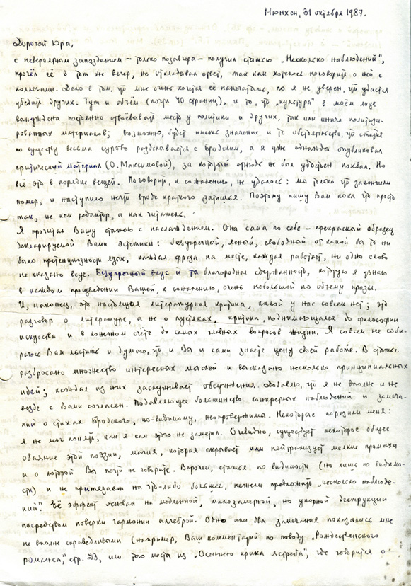 с невероятным запозданием — только вчера — получил статью «Несколько наблюдений» [статью Ю. К. о Бродском], прочёл её в тот же вечер, но откладывал ответ, так как хотелось поговорить о ней с коллегами [то есть с другими двумя редакторами мюнхенского журнала Страна и мир, из которых фактически (не номинально) главным редактором был Кронид Любарский (1934-1996); см. письмо Ю. К. к Любарскому]. Дело в том, что мне очень хочется её напечатать, но я не уверен, что удастся убедить других. Тут и объём (почти 40 страниц), и то, что «культура» в моем лице вынуждена постоянно отвоевывать место у политики и других, так или иначе политизированных материалов; возможно, будет иметь значение и то обстоятельство, что статья по существу весьма сурово разделывается с Бродским, а я уже однажды опубликовал критический материал (O. Максимовой), за который отнюдь не был удостоен похвал. Но всё это в порядке вещей. Поговорить, к сожалению, не удалось: мы только что закончили номер, и наступило нечто вроде краткого затишья. Поэтому пишу Вам пока что просто так, не как редактор, а как читатель.