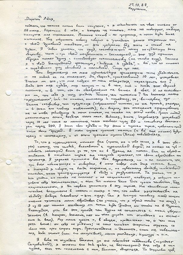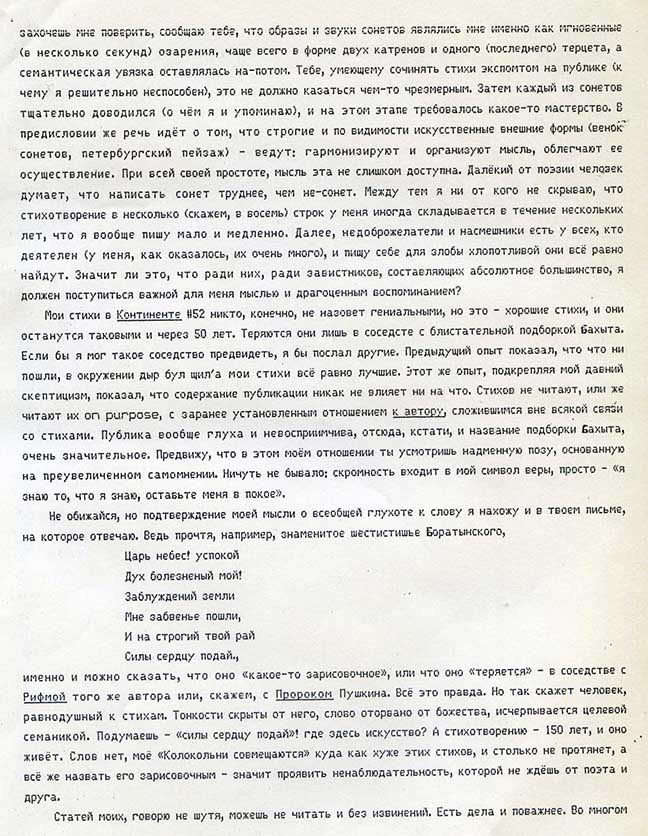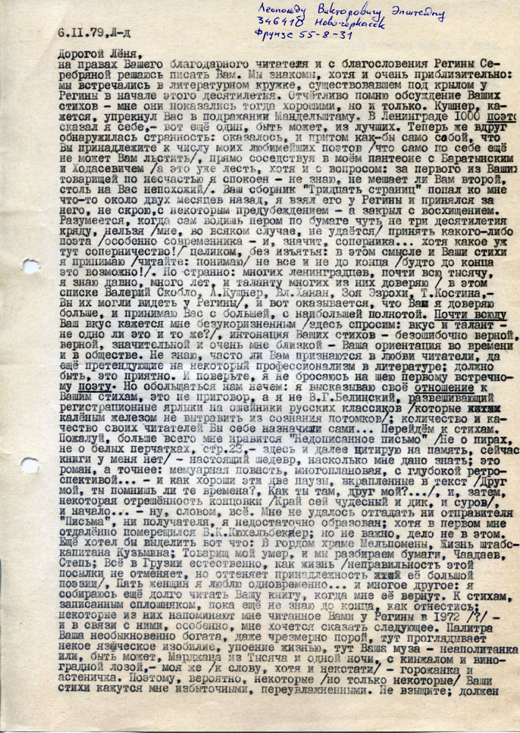 на правах Вашего благодарного читателя и с благословения Регины Серебряной решаюсь писать Вам. Мы знакомы, хотя и очень приблизительно: мы встречались в литературном кружке, существовавшем под крылом у Регины в начале этого десятилетия. Отчётливо помню обсуждение Ваших стихов — мне они показались тогда хорошими, но и только. Кушнер, кажется, упрекнул Вас в подражании Мандельштаму. В Ленинграде 1000 поэтов, сказал я себе, — вот ещё один, быть может, из лучших. Теперь вдруг обнаружилась странность: оказалось, и притом как-бы само собой, что Вы принадлежите к числу моих любимейших поэтов (что само по себе ещё не может Вам льстить), прямо соседствуя в моём пантеоне с Баратынским и Ходасевичем (а это уже лесть, хотя и с вопросом: за первого из Ваших товарищей по несчастью я спокоен — не знаю, не мешает ли Вам второй, столь на Вас непохожий). Ваш [машинописный] сборник «Тридцать страниц» попал ко мне что-то около двух месяцев назад, я взял его у Регины и принялся за него, не скрою, с некоторым предубеждением — а закрыл с восхищением. Разумеется, когда сам водишь пером по бумаге чуть не три десятилетия кряду, нельзя (мне, во всяком случае, не удаётся) принять какого-либо поэта (особенно современника — и, значит, соперника… хотя какое уж тут соперничество!) целиком, без изъятья: в этом смысле и Ваши стихи я принимаю (читайте: понимаю) не все и не до конца (будто до конца это возможно!). Но странно: многих ленинградцев, почти всю тысячу, я знаю давно, много лет, и таланту многих из них доверяю (в этом списке Валерий Скобло, А. Кушнер, Вл. Ханан, Зоя Эзрохи, Т. Костина, — Вы их могли видеть у Регины), и вот оказывается, что Вам я доверяю больше, и принимаю Вас с большей полнотой. Почти всюду Ваш вкус кажется мне безукоризненным (здесь спросим: вкус и талант — не одно ли это и то же?), интонация Ваших стихов — безошибочно верной, верной, значительной и очень мне близкой — Ваша ориентация во времени и в обществе. Не знаю, часто ли Вам признаются в любви читатели, да еще претендующие на некоторый профессионализм в литературе; должно быть, это приятно. И поверьте, я не бросаюсь на шею первому встречному поэту. Но обольщаться Вам нечем: я высказываю своё отношение к Вашим стихам, это не приговор, а я не В. Г. Белинский, развешивающий регистрационные ярлыки на ошейники русских классиков (которые калёным железом не вытравить из сознания потомков); количество и качество своих читателей Вы себе назначили сами… Перейдём к стихам. Пожалуй, больше всего мне нравится «Недописанное письмо» (Не о пирах, не о белых перчатках, стр. 23), — и здесь и далее цитирую на память, сейчас книги у меня нет, — настоящий шедевр, насколько мне дано знать; это роман, а точнее: мемуарная повесть, многоплановая, с глубокой ретроспективой… — и как хороши эти две паузы, вкрапленные в текст (Друг мой, ты помнишь ли те времена?, Как ты там, друг мой?… ), и, затем, некоторая отрешённость концовки (Край сей чудесный и дик, и суров), и начало… — ну, словом, всё. Мне не удалась отгадать ни отправителя «Письма», ни получателя, я недостаточно образован; хотя в первом мне отдалённо померещился В. К. Кюхельбеккер; но не важно, дело не в этом. Ещё хотел бы выделить вот что: В гордом храме Мельпомены; Жизнь штабс-капитана Кузьмина; Товарищ мой умер, и мы разбираем бумаги; Чаадаев, Степь; Всё в Грузии естественно, как жизнь (неправиль