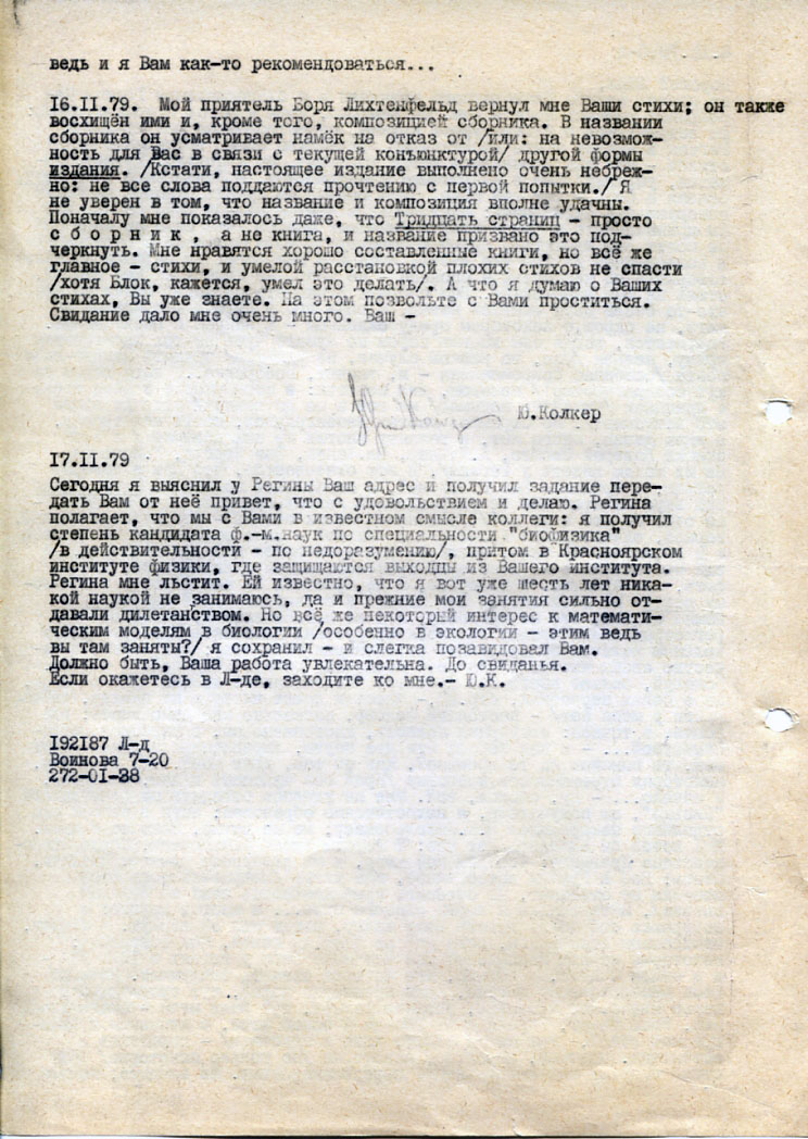 16.11.79. Мой приятель Боря Лихтенфельд вернул мне Ваши стихи; он также восхищён ими и, кроме того, композицией сборника. В названии сборника он усматривает намёк на отказ от (или: на невозможность для Вас в связи с текущей конъюнктурой) другой формы издания. (Кстати, настоящее издание выполнено очень небрежно: не все слова поддаются прочтению с первой попытки.) Я не уверен в том, что название и композиция вполне удачны. Поначалу мне показалось даже, что Тридцать страниц — просто сборник, а не книга, и название призвано это подчеркнуть. Мне нравятся хорошо составленные книги, но всё же главное — стихи, и умелой расстановкой плохих стихов не спасти (хотя Блок, кажется, умел это делать). А что я думаю о Ваших стихах, Вы уже знаете. На этом позвольте с Вами проститься. Свидание дало мне очень много. Ваш —