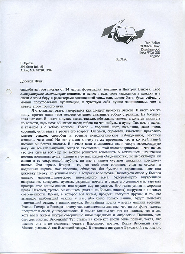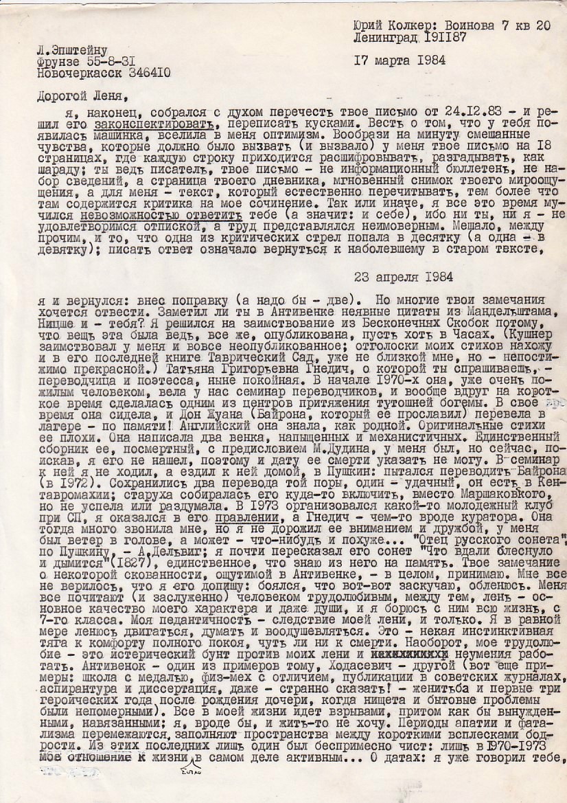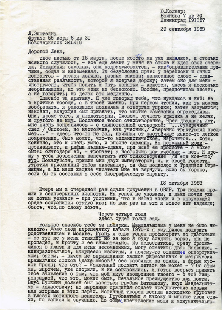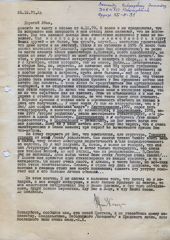 спасибо за книгу и письмо от 4.12.79. Я вовсе и не предполагал, что Вы вспомните мою внешность и мои стихи; даже надеялся, что не вспомните. Так что никакой досады Ваше счастливое неведенье у меня не вызывает. Моя всесторонняя известность в кругу Ваших друзей [Эпштейн спросил у себя в институте в Новочеркасске, кто такой Юрий Колкер; один ответил ему: ленинградский поэт, другой сказал: ленинградский биофизик] — не более, чем курьёз, случай… настолько удивительный что даже почти и не лестный. Стихи я не публикую с 1975 (а всего было восемь маленьких публикаций, притом одна под псевдонимом); по радио Вы могли слышать песни композитора А. Колкера, моего однофамильца, но никак не меня (о научной же моей известности и говорить нечего). Вообще, с русско-советской литературой я нахожусь в ссоре… а заодно и с Кушнером, стихи которого, тем не менее, люблю… Действительно, я старше Вас, но, вероятно, не слишком: мне 33; просто графомания постигла меня в очень раннем возрасте, и с тех пор не отпускает; да и вообще разница в возрасте, пусть даже большая, — ещё не повод для установления табели о рангах. Совершенно согласен с Вами, что чтение должно быть взаимным, — и вынужден просить у Вас прощения: сейчас мне нечего Вам послать. Я тоже хотел бы представиться Вам организованной подборкой, а не отдельными стихотворениями. Мне это особенной важно: мои стихи коротки. Но жизнь так замотала меня в последнее время, что ни на что серьёзное сил не хватает. Этим же объясняется и моя задержка с ответом на Ваше письмо, за что также прошу меня извинить. В хорошие времена я ставил себе в обязанность отвечать на письмо в день его получения… У меня вышли (в том же издательстве, что и у Вас [то есть в самиздате]) две совсем маленьких «книги»: Кентавромахия, 1972, сорок пять стихотворений, в количестве 20 экземпляров; и Послесловие, 1975, затем 1979 (вторая редакция), около шестидесяти стихотворений, обе редакции в одном экземпляре. Кентавромахию я собираюсь (уже давно) пересоставить, а Послесловие — размножить, но Бог весть когда это мне удастся. Пока же у меня ничего нет. Прошу Вас верить, что я очень заинтересован в Вашем мнении; при первой же возможности пришлю Вам что-нибудь.