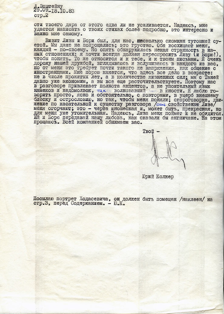 Посылаю портрет Ходасевича, он должен быть помещен (наклеен) на стр. 3, перед Содержанием [Речь идёт о фотографическом (переснятом, конечно) портрете Ходасевича, который я прошу вклеить в машинописный (формата А4) том собрания стихов Ходасевича. Это собрание я подготовил и выпустил в ленинградском самиздате, а затем оно было пререпечатано в Париже. Когда я дарил этот том Эпштейну во время нашей встречи в Ленинграде, фотография ещё не была готова.]. — Ю. К.
