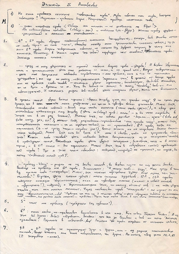 В своём (ответном?) письме от 24.12.1983 Эпштейн критикует мой Антивенок. Я дорожил его критикой, хотел внимательно её перечитывать… и не мог — из-за неразборчивого почерка моего корреспондента. Поэтому в марте 1984 года я законспектировал письмо Эпштейна. Письмо утрачено (его не удалось взять с собою в эмиграцию в июне 1984 года), а конспект сохранился. В нём буквой М обозначен магистрал венка (он у меня идёт вначале Антивенка), а числа от 1 до 14 с точкой — номерам сонетов. Вот этот конспект 1984 года: