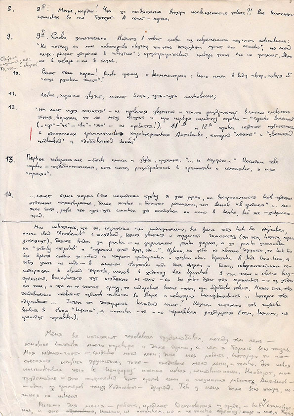 Теперь о твоих переводах [сонетов Шекспира]. Приступаю к критике, намеренно не заглядывая в подлинник, то есть говорю только о русских стихах.