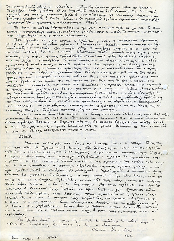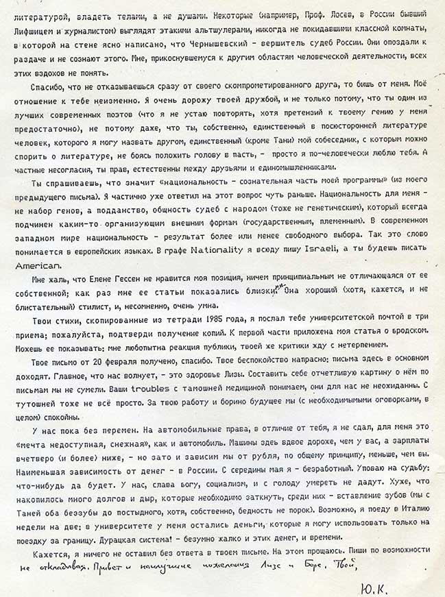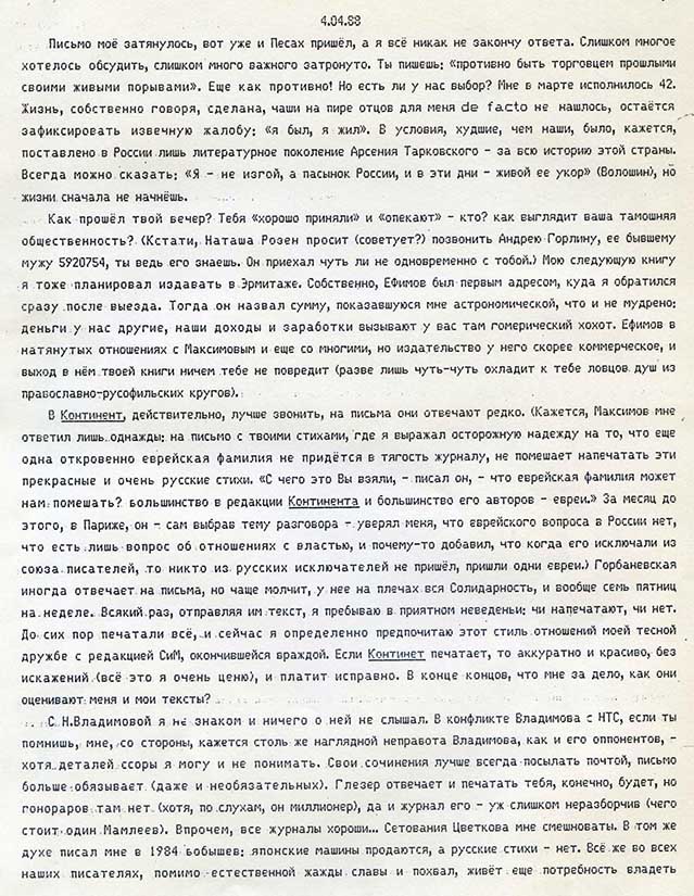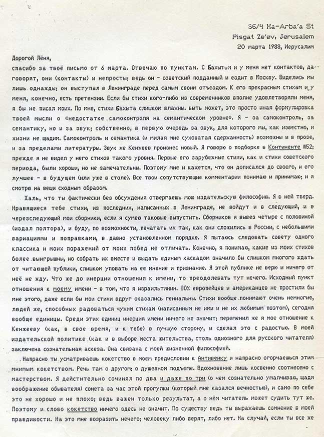 спасибо за твоё письмо от 6 марта. Отвечаю по пунктам. С Бахытом [Кинжеевым] и у меня нет контактов, да говорят, они (контакты) и непросты; ведь он — советский подданный и ездит в Москву. Виделись мы лишь однажды; он выступал в Ленинграде перед самым своим отъездом. К его прекрасным стихам и у меня, конечно, есть претензии. Если бы стихи кого-либо из современников вполне удовлетворяли меня, я бы не писал моих. По мне, стихи Бахыта слишком влажны, быть может, это просто иная формулировка твоей мысли о «недостатке самоконтроля на семантическом уровне». Я — за самоконтроль, за семантику, но и за звук; собственно, в первую очередь за звук, для которого мы, как известно, и жизни не щадим. Самоконтроль и семантика (и милая мне суховатая сдержанность) возможны и в прозе, и за пределами литературы. Звук же Кенжеев произнес новый. Я говорю о подборке в Континенте №52; прежде я не видел у него стихов такого уровня. Первые его зарубежные стихи, как и стихи советского периода, были хороши, но не замечательны. Поэтому мне и кажется, что он дописался до своего, и его лучшее — в будущем (или уже в столе). Все твои сопутствующие комментарии понимаю и принимаю; и я смотрю на вещи сходным образом.