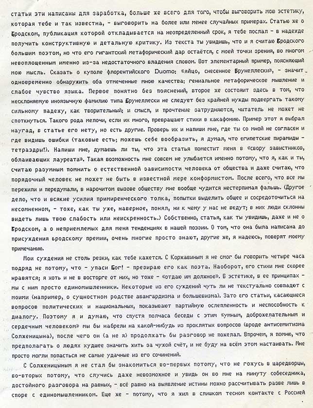 Статей моих, говорю не шутя, можешь не читать и без извинений. Есть дела и поважнее. Во многом статьи эти написаны для заработка, больше же всего для того, чтобы выговорить мою эстетику, которая тебе и так известна, — выговорить на более или менее случайных примерах. Статью же о Бродском, публикация которой откладывается на неопределенный срок, я тебе послал — в надежде получить конструктивную и детальную критику. Из текста ты увидишь, что и я считаю Бродского большим поэтом, но что его гигантский метафорический дар остаётся, с моей точки зрения, во многом невоплощенным именно из-за недостаточного владения словом. Вот элементарный пример, поясняющий мою мысль. Сказать о куполе флорентийского Duomo: «яйцо, снесенное Брунеллески», — значит, одновременно обнаружить оба отмеченные мною качества: гениальное метафорическое мышление и слабое чувство языка. Первое понятно без пояснений, второе же состоит здесь в том, что несклоняемую иноязычную фамилию типа Брунеллески не следует без крайней нужды подвергать такому сильному падежу, как творительный: и смысл, и прочтение затрудняются, читатель не может не споткнуться. Такого рода мелочи, если их много, превращают стихи в какофонию. Пример этот я выбрал наугад, в статье его нету, но есть другие. Проверь их и напиши мне, где ты со мной не согласен и где видишь ошибки (таковые есть; можешь себе вообразить, я думал, что египетские пирамиды — тетраэдры!). Напиши мне, думаешь ли ты, что эта статья поместит меня в «свору завистников, облаивающих лауреата». Такая возможность мне совсем не улыбается именно потому, что я, как и ты, считаю разумным помнить о естественной зависимости человека от общества и даже считаю, что порядочный человек не может не быть в известной мере конформистом. После всего, что все мы пережили и передумали, в нарочитом вызове обществу мне вообще чудится нестерпимая фальшь. (Другое дело, что и всякие усилия примиренческого толка, попытки выделить общее и сосредоточиться на несомненном, — тоже, как ты уже, наверное, понял, ни к чему у нас не ведут; в них люди склонны видеть лишь твою слабость или неискренность.) Собственно, статья, как ты увидишь, даже и не о Бродском, а о неприемлемых для меня тенденциях в нашей поэзии. О том, что она была написана до присуждения Бродскому премии, очень многие просто знают, другие же, я надеюсь, поверят моему примечанию.