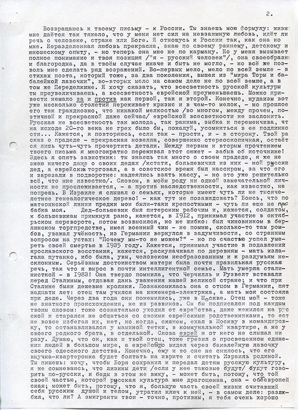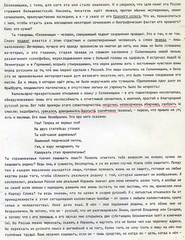 Ты говоришь: «Солженицын — человек, совершивший подвиг сохранения правды». Это и так, и не так. Слово подвиг вяжется с этим страстным и самоотверженным человеком, а слово правда — лишь наполовину. Во-первых, лучшую его правду произнесли во многом до него, она лишь не была услышана; во-вторых, и это главное, старая правда уж слишком заслонена у Солженицына новой ложью: разжиганием ксенофобии, перекладыванием вины с больной головы на здоровую. Я встречал людей (в Ленинграде и в Германии), всерьёз утверждавших, что евреи должны жить с постоянным чувством вины перед русскими за то, что они (евреи) сделали с Россией. Эти люди ссылались на Солженицына, и была это не произвольная интерпретация дум великого писателя, нет, это было точное следование его мысли. Да и люди, о которых идёт речь, не были недоучками или тупицами. (Припоминаю одну даму во Фрайбурге, плодовитого математика; в отсутствии логики ее упрекнуть было бы непросто.)
