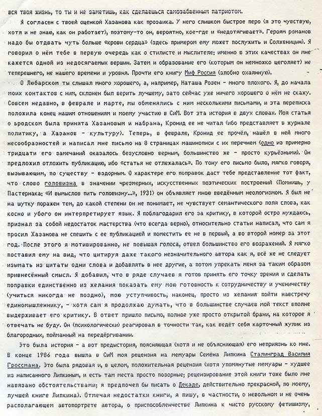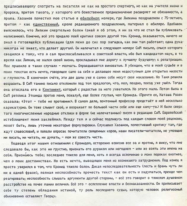 О Любарском ты слышал много хорошего, а, например, Наташа Розен — много плохого. Я, до начала моих контактов с ним, склонен был верить лучшему, зато сейчас уже ничего хорошего о нём не скажу. Совсем недавно, в феврале и марте, мы обменялись с ним несколькими письмами, и эта переписка положила конец нашим отношениям и моему участию в СиМ [мюнхенский журнал Страна и мир]. Вот эта история в двух словах. Моя статья о Бродском была принята Хазановым [один из редакторов журнала Страна и мир] и набрана, Кронид ее не читал (ибо представляет в журнале политику, а Хазанов — культуру). Теперь, в феврале, Кронид ее прочёл, нашёл в ней много несообразностей и написал мне письмо на 8 страницах машинописи с их перечнем (одно из примерно тридцати его замечаний оказалось безусловно верным, большинство же — просто курьёзными). Он предложил отложить публикацию, ибо «статья не отлежалась». По тону его письмо было, мягко говоря, вызывающим, по существу — вздорным. О характере его поправок даст тебе представление тот факт, что слово головизна в значении чрезмерных, искусственных поэтических построений (помнишь, у Пастернака: «И вымыслов пить головизну…», 1931) он объявляет мною введённым неологизмом. Я был не на шутку поражен тем, до какой степени он не понимает, не чувствует семантического поля слова, как косно и убого он интерпретирует язык. Я поблагодарил его за критику, в которой остро нуждаюсь, признал за собой недостаток мастерства (что всегда верно), относительно статьи написал, что сам я просил Хазанова не спешить с ее публикацией и поместить ее не в первый, а во второй номер за этот год. После этого я мотивированно, не повышая голоса, отвел большинство его возражений. Я мягко поставил ему на вид, что цитируя даже такого незначительного автора как я, всё же не следует изымать из цитаты одни слова и добавлять в нее другие, а потом упрекать меня за таким образом привнесённый смысл. Я добавил, что в ряде случаев я готов принять его точку зрения и сделать поправки единственно из желания показать ему мою готовность к сотрудничеству и ученичеству (учиться никогда не поздно), мою уступчивость, наконец, просто из желания пойти навстречу единомышленнику, — хотя сам я продолжаю думать, что в большинстве случаев мой текст вполне выдерживает его критику. В ответ пришло письмо, полное уже просто открытой брани, на которое я отвечать не буду. Он (психологически) реагировал в точности так, как ведёт себя карточный жулик из благородных, пойманный на передёргивании.