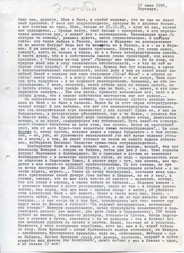 Да-да, не отступлюсь от этого: замечательный поэт, умнейший и достойнейший человек, но я давно разлюбил его стихи, разошёлся с ним в чём-то очень важном для меня (то есть и его разлюбил), и вот теперь, собрав и перечитав уцелевшие письма, прощаюсь с ним навсегда. Писем Эпштейна ко мне сохранилось около сорока. Все они теперь собственность Гуверовского института при Станфорде… Ты, я предвижу, скажешь, что некоторые из моих писем к Эпштейну не делают мне чести. Пожалуй, что и так. Ну, да я ведь не чести домогаюсь.