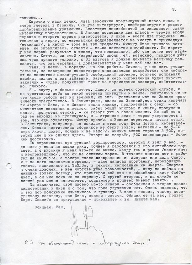 Десять дней назад получил я электронное письмо от Лии Геселевой: она спрашивала твой адрес. Тут я понял, что должен написать тебе, хоть две строчки. Всё это время твое октябрьское письмо в развернутом виде лежало у меня на столе.