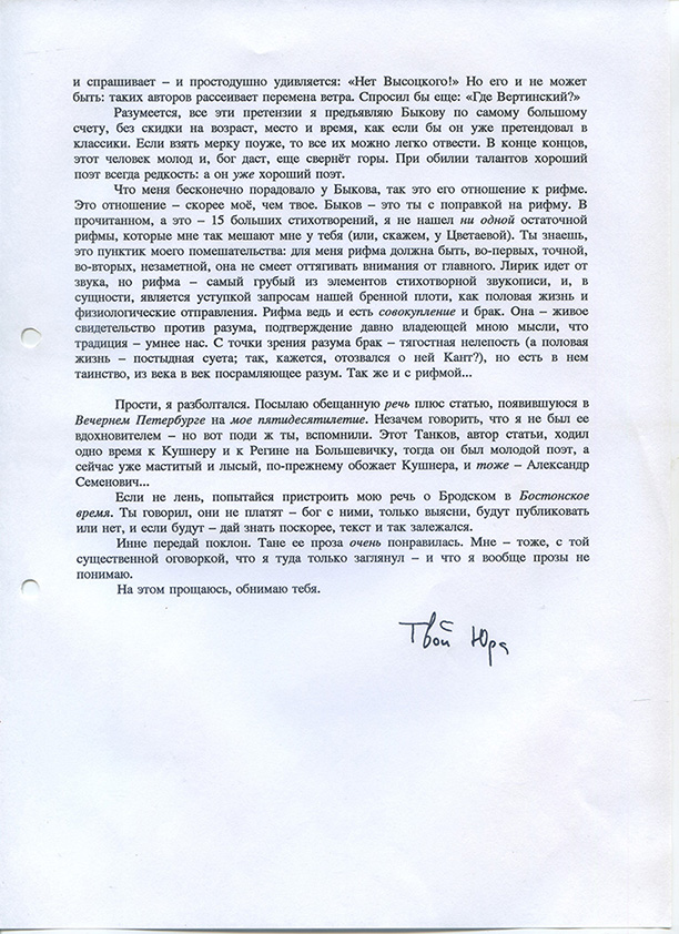 Верно, что в 50-60-е неточная рифма воспринималась как глоток свободы. Я сам отдал ей ужасающую дань. Твое замечание о возврате к более строгой рифме в 70-е в результате подъема национального самосознания кажется мне очень точным и глубоким. «Необразованность не приводит к добру» в отношении Евтушенка и Есенина — тоже замечательно верно. На слова «Как мне кажется, сейчас точные или неточные рифмы не несут этической нагрузки» — мне возразить нечего; это мнение. Мне кажется другое, вот и всё. Ты ближе к здравому смыслу, я же по видимости говорю недоказуемый вздор. Но мне всё-таки кажется. Ты выражаешь уже и вовсе безупречный здравый смысл, когда говоришь об относительности языка, о текучести его форм и ценности этих форм. В этом пункте сойдемся на том, что я увлекаюсь парадоксами и не люблю здравого смысла. В других случаях я его буду любить.