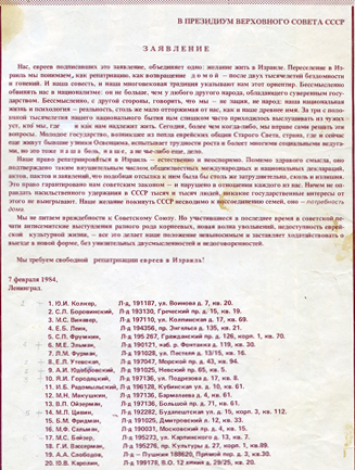 Мы не питаем враждебности к Советскому Союзу. Но участившиеся в последнее время в советской печати антисемитские выступления разного рода корнеевых, новая волна увольнений, недоступность еврейской культурной жизни, — все это делает наше положение невыносимым и заставляет ходатайствовать о выезде в новой форме, без унизительных двусмысленностей и недоговоренностей.