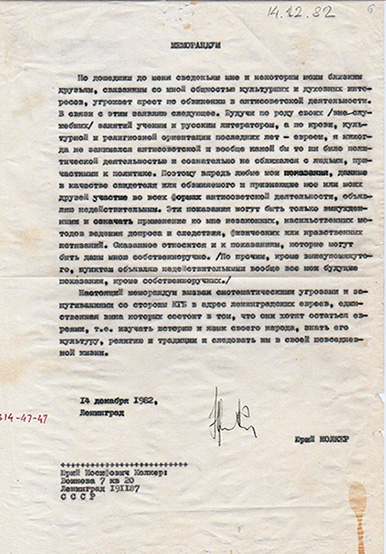 Настоящий меморандум вызван систематическими угрозами и запугиваниями со стороны КГБ в адрес ленинградских евреев, единственная вина которых состоит в том, что они хотят остаться евреями, т. е. изучать историю и язык своего народа, знать его культуру, религию и традиции и следовать им в своей повседневной жизни.