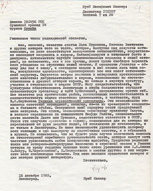 вам, конечно, известны статьи Льва Корнеева, Евгения Вистунова и других авторов того же толка, которые, выступая под лозунгом антисионизма, на деле способствует воскрешению антисемитизма, искусственно насаждают неприязнь к евреям, фальсифицируют и извращают факты и доктрины. Антисемитизм осуждён цивилизованными народами и самой историей, но антисемиты, как и все прочие, имеют право свободно выражать свои убеждения на страницах нашей печати. К сожалению (полагаю — общему для нас с вами), в последние месяцы в ней слышна лишь одна нота, выступления одноплановы, односторонни: все они носят антисемитский характер. Ощущается острая нехватка в материалах противоположного свойства: доброжелательных к евреям, напоминающих их соотечественникам о древней истории евреев, их вкладе в мировую культуру, участии в становлении и защите СССР. Могу свидетельствовать, что культурная общественность Ленинграда в своём большинстве осуждает антисемитскую пропаганду и ждёт публикаций, направленных против неё. Мне известен ряд критических работ, показывающих несостоятельность и некомпетентность видных советских антисемитов, в частности, труд И. Ф. Мартынова Рецидив черносотенной пропаганды. Эти исследования отклонены советской периодикой, полагаю, из-за их чрезмерного академизма и большого объёма. Совершенно иной характер носит предлагаемый мною материал. Это стихи, посвященные еврейскому празднику Ханука, и вольные переложения из знаменитого Иехуды Галеви, национального поэта масштаба Данте или Пушкина, недостаточно известного в СССР. Стихи эти получили признание и оценку, неожиданные для их автора: их переписывают от руки десятки людей, от школьников до пенсионеров, и не только в Ленинграде. Не имея возможности удовлетворить интересу всех желающих и идя навстречу их настойчивым советам, я и обращаюсь в журнал. Не сомневаюсь, что вы будете рады случаю напечатать несколько стихотворений еврейского русскоязычного поэта, которые смогут хоть частично уравновесить собою выступления юдофобов. Предлагаю редакции также мои историко-литературные изыскания о еврейской поэзии в России, которая по праву гордится именами таких своих уроженцев как Х. Н. Бялик, З. Шнеур, Ш. Черниховский, И. Каценельсон и многие другие: о них запросите меня специальным письмом. Ряд моих находок представит интерес и для истории русской литературы.
