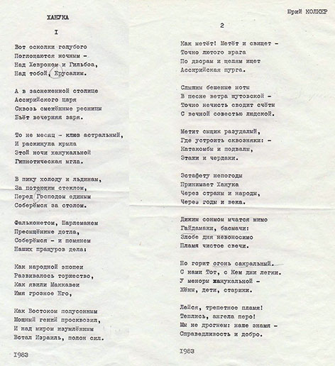 Но как быть со стихами? Ведь смертельно хочется чуть-чуть пошевелить их, поправить! Или драгоценнее сохранить документ 34-летней давности? Я ведь, если честно, уже и поправил кое-что: из двух ханукальных стихотворений выкроил одно… А вот и соломоново решение: вывешиваю картинки оригиналов и тут же даю поправленный текст. Правы оба, я тогдашний и я теперешний.