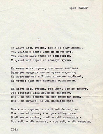 На свете есть страна, где я не буду лишним: Там хлебом и водой меня не попрекнут, Там именем моим толпа не оскорбится, И лучший мой порыв не назовут чужим. На свете есть страна, где званье человека Величьем предков мне не нужно искупать, Не встретят там мой стон холодною издевкой, Не станет боль моя народным торжеством. На свете есть страна, где мысль мою не свяжут, Где гордости моей ярмом не оскорбят, Где с барского стола за честное холопство Меня не поощрят вчерашним пирогом. На свете есть земля скорбей тысячелетних, Прогорклая земля пророческой мечты. Она — не рай земной: но мне найдется пища. Она не широка: но мне найдется кров. Она — моя страна, и в ней мое бессмертье, Я — злак ее долин, я — прах ее пустынь. В ее земле взойти, с ее землей смешаться — Вот все, о чем молюсь, вот все, о чем скорблю. 5.02.83 |