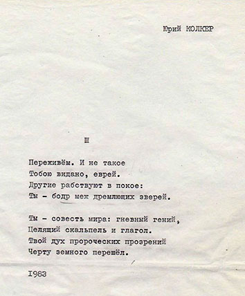 | III Переживём. И не такоеТобою видано, еврей. Другие рабствуют в покое: Ты — бодр меж дремлющих зверей. Ты — совесть мира: гневный гений, Целящий скальпель и глагол. Твой дух пророческих прозрений Черту земного перешёл. 1.12.83 |