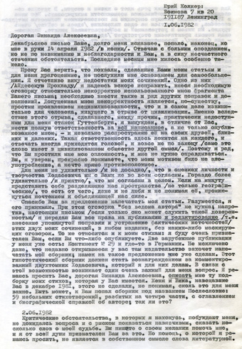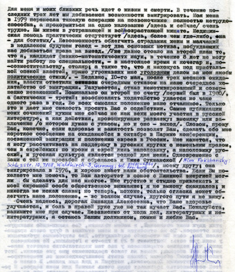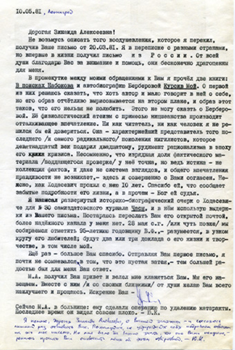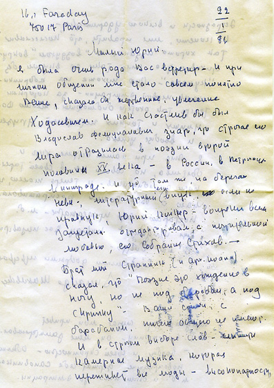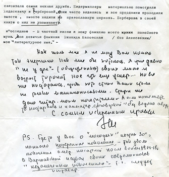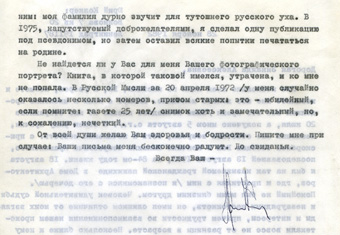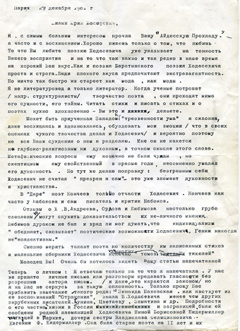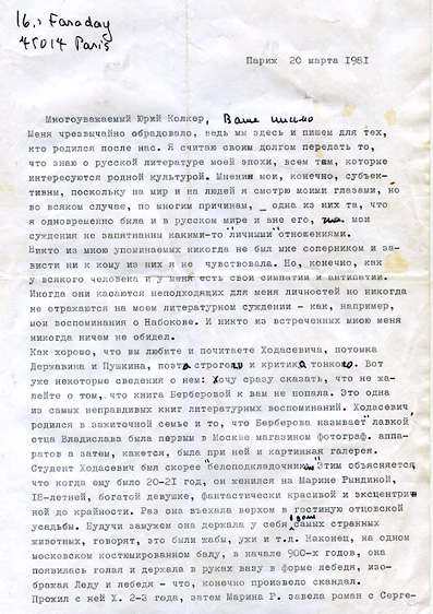 Зная о Вашей чрезвычайной занятости, всё же решаюсь беспокоить Вас — на правах Вашего (русского) читателя и при сочувственном попустительстве нашего общего знакомого [ленинградского архитектора Михаила Азарьевича Краминского, 1899-1982], навещавшего Вас в текущем [1981] году. Для меня и для многих, кто родился в России после второй мировой войны, Ваши мемуары (литературные силуэты, если воспользоваться Вашим словом) представляют живейший интерес и драгоценны двояко — как прекрасное литературное произведение и как добросовестные свидетельства современника. Многие имена, которые Вы называете, перестали быть для нас только символами далёкого прошлого и сделались предметом пристального и благодарного внимания. Едва ли не первое из них — имя Владислава Ходасевича, любимейшего моего поэта в XX веке. 28 мая 1986 исполнится 100 лет со дня его рождения. Моя давняя мечта — написать о нём и, в частности, восстановить, насколько это мыслимо, важнейшие черты его биографии, стирающиеся на наших глазах. Вы знали его лично. Не найдете ли возможным сообщить мне о нём некоторые сведения? Надеюсь, что непраздный интерес, питаемый мною к Ходасевичу и его окружению, способен несколько искупить в Ваших глазах дерзость моей просьбы… Вот основные вопросы. Вы мельком упоминаете его первую жену Рындину — какова хронология и судьба их брака? Какое место в жизни Ходасевича занимала Н. Н. Берберова (её Воспоминания оказались для меня недоступными)? Какова девичья фамилия его (третьей?) жены Ольги Борисовны? Меня интересуют также подробности его парижской жизни, вплоть до мельчайших, и обстоятельства его кончины… Я не имею права рассчитывать на развернутый ответ, но спешу Вас уверить, что каждое Ваше слово и самый факт Вашего ответа на моё письмо, если таковой возможен, будут расценены мною на вес золота. В любом случае Вашим почтительным должником остаётся —