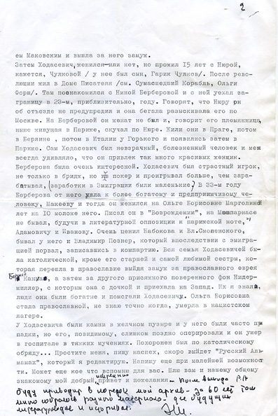У Ходасевича были камни в желчном пузыре и у него были часто припадки, но его, по-видимому, слишком поздно оперировали и он умер в госпитале в тяжких мучениях. Похоронен был по католическому обряду… Простите меня, пишу наспех, скоро выйдет «Русский Альманах» который я редактирую. Напишу еще при малейшей возможности. Может еще кое что вспомню для Вас. Шлю Вам и нашему общему знакомому [М. А. Краминскому] мой добрый, искренний привет и пожелания — после выхода Р.А. буду приводить в порядок мой архив — за 60 лет там много собралось разного материала — для будущих литературоведов и историков.