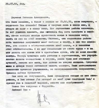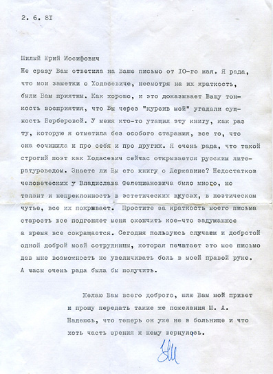 Не сразу Вам ответила на Ваше письмо от 10-го мая. Я рада, что мои заметки о Ходасевиче, несмотря на их краткость, были Вам приятны. Как хорошо, и это доказывает Вашу тонкость восприятия, что Вы через «Курсив мой» угадали сущность Берберовой. У меня кто-то утащил эту книгу, как раз ту, которую [в которой] я отметила без особого старания, все то, что она сочинила и про себя и про других. Я очень рада, что такой строгий поэт как Ходасевич сейчас открывается русским литературоведом. Знаете ли Вы его книгу о Державине? Недостатков человеческих у Владислава Фелециановича [sic] было много, но талант и непреклонность в эстетических вкусах, в поэтическом чутье, все их покрывает. Простите за краткость моего письма, старость все подгоняет меня окончить кое-что задуманное[,] а время все сокращается. Сегодня пользуюсь случаем и добротой одной доброй моей сотрудницы, которая печатает это мое письмо, дав мне возможность не увеличивать боль в моей правой руке. А Часы [ленинградский самиздатовский журнал] очень рада была бы получить.