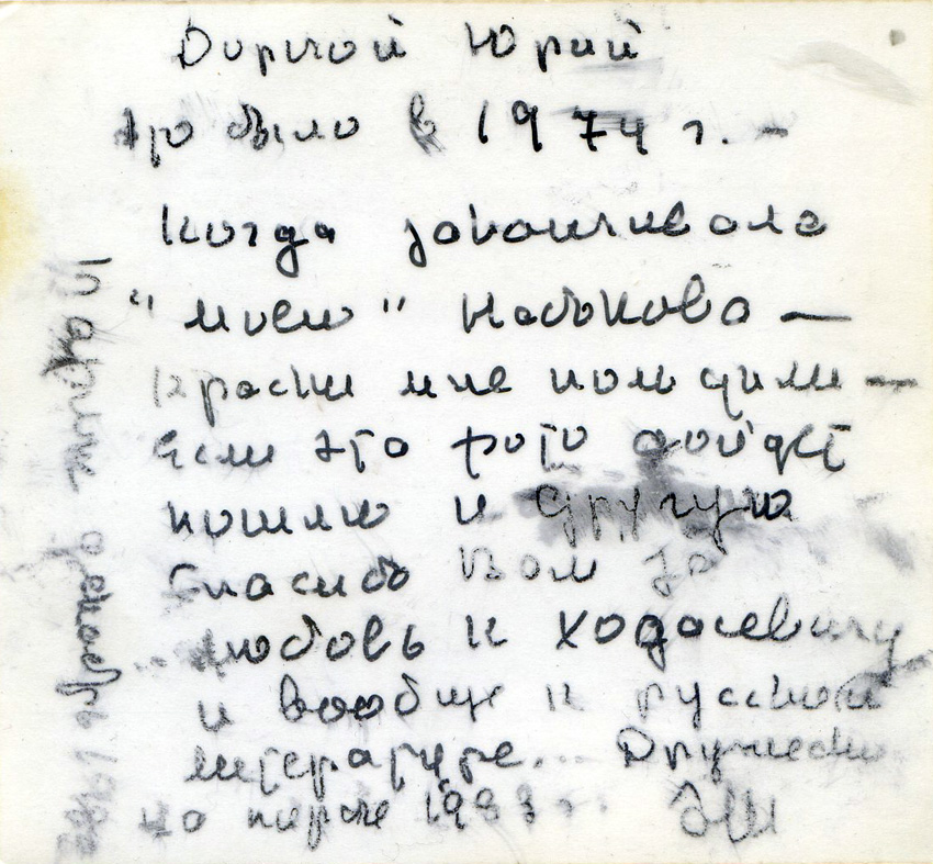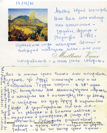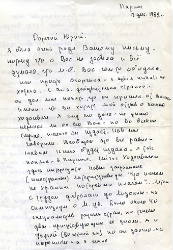 Шлю Вам наилучшие пожелания — здоровья, бодрости и творчества в 1982 г. Приехавшие сюда ненадолго Евгений и Виктория [Левины, недавние эмигранты, поселившиеся в Нью-Йорке и гостившие в Париже, ленинградские друзья Ю. К.] навестили меня — мне они понравились — и очень тепло говорили о Вас. И милые стихи Ваши мне понравились. Надеюсь, что будут напечатаны — хоть и не сборником. Трудно поэтам… В 20х годах тут, выпускали мы миниатюрные сборнички и печатали их в количестве от 100 — до 300 экз. и читали их друг другу в парижских кафе. А зарабатывали кто чем мог — и на заводах и в винных лавках, и малярами и полотерами, а теперь эти сборнички библиофилы разыскивают! Впрочем и франц. поэты — поэзией не зарабатывают… И все же писать стихи нужно. Простите за каракули — правая рука от полвека писательства — болит.