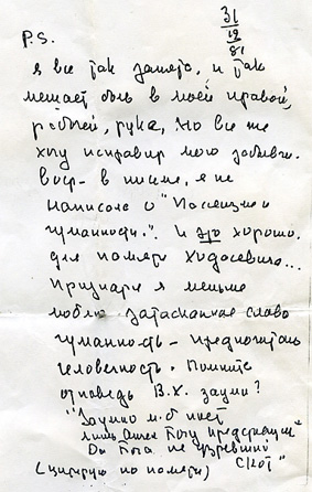 Не возьмусь описать того воодушевления, которое я пережил, получив Ваше письмо от 20.03.81. Я в переписке с разными странами, но впервые в жизни получил письмо из России. От всей души благодарю Вас за внимание и помощь, они бесконечно драгоценны для меня.