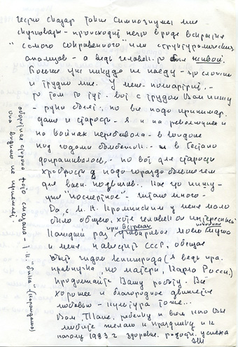 Желаю Вам всего доброго, шлю Вам мой привет и прошу передать такие же пожелания М. А. [Михаилу Азарьевичу Краминскому, 1899-1982] Надеюсь, что теперь он уже не в больнице и что хоть часть зрения к нему вернулась.