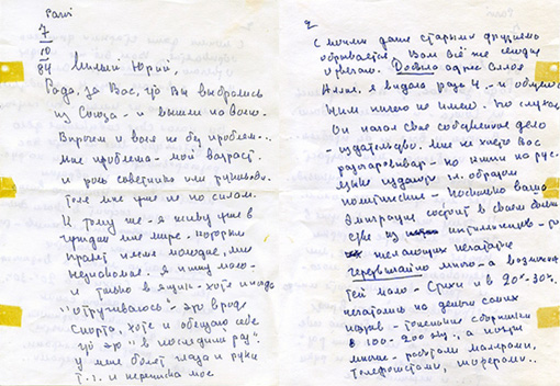 Многоуважаемый Юрий Колкер, Ваше письмо меня чрезвычайно обрадовало, ведь мы здесь и пишем для тех, кто родился после нас. Я считаю своим долгом передать то, что знаю о русской литературе моей эпохи, всем тем, которые интересуется родной культурой. Мнения мои, конечно, субъективны, поскольку на мир и на людей я смотрю моими глазами, но во всяком случае, по многим причинам, — одна из них та, что я одновременно была и в русском мире и вне его, — но мои суждения не запятнанны [sic] какими-то «личными» отношениями. Никто из мною упоминаемых никогда не был мне соперником и зависти ни к кому из них я не чувствовала. Но, конечно, как у всякого человека[,] и у меня есть свои симпатии и антипатии. Иногда они касаются неподходящих для меня личностей[,] но никогда не отражаются на моем литературном суждении — как, например, мои воспоминания о Набокове. И никто из встреченных мною меня никогда ничем не обидел.
