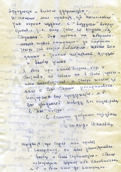 Пожалуйста, если я могу быть вам чем-то полезной хотя бы в новой России, с которой счеты у меня особые, или во Франции [фраза не закончена]. «Рус.мысль» по-моему кончается и там и тут — грызней, как обычно. Обнимаю Вас, приветствую вашу семью, и всем вам желаю, чтобы с вами [пропуск] нечто благоприятное.