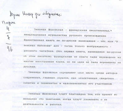 — Зинаида Шаховская. О семье Набокова (рукопись, вероятная дата: 1987)