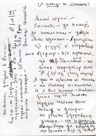 [Привожу последнее письмо, полученное мною от Зинаиды Шаховской. Дата в левом верхнем углу первой страницы и подпись на второй странице принадлежат самой Зинаиде Шаховской, остальное написано кем-то из ее помощников, притом со смысловыми сбоями и купюрами (которые, конечно, могли принадлежать и самой писательнице, диктовавшей в рассеянности). — Ю. К.]